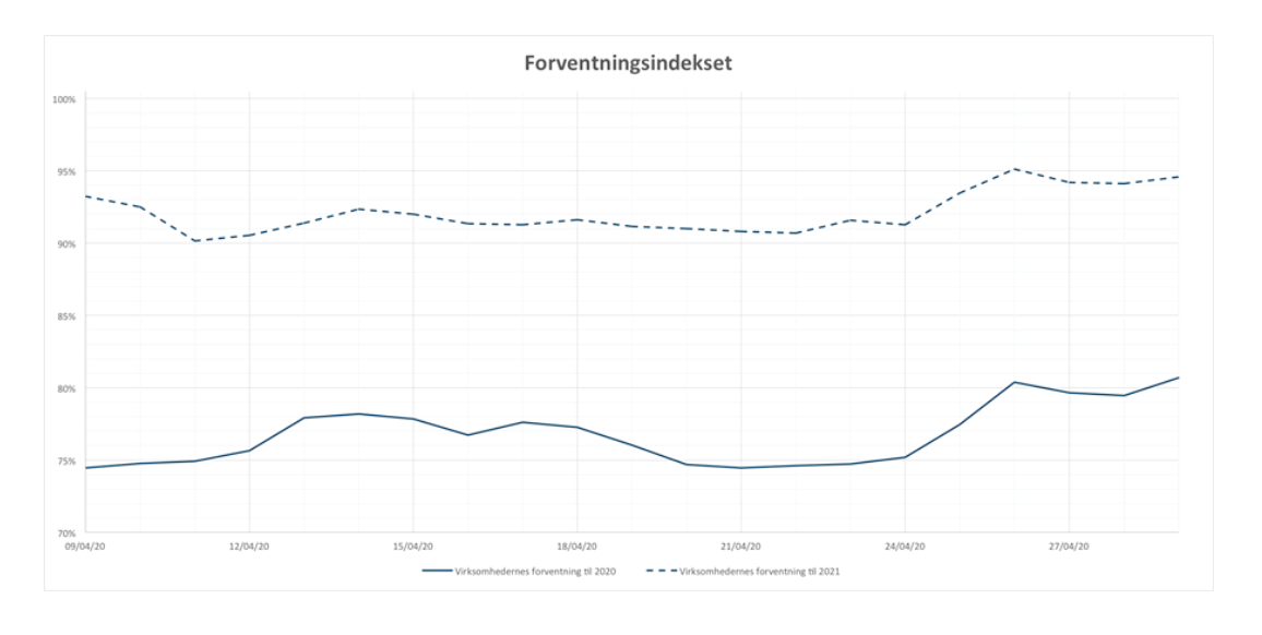 Siden 9. april har de spurgt 500 virksomhedsejere hver dag, hvad deres forventninger er til virksomhedens økonomiske resultat i henholdsvis 2020 og 2021 i lyset af pandemien. På baggrund af dette har Center for Ejerledede Virksomheder i samarbejde med Copenhagen Business School (CBS) og med støtte fra Industriens Fond udarbejdet Erhvervslivets forventningsindeks. Forventningsindekset er især interessant at kigge nærmere på, fordi det fortæller om de økonomiske forventninger hos størstedelen af dansk erhvervslivs små- og mellemstore virksomheder, som ikke kan måles i noterede aktieindeks m.m. Indekset kan findes på www.ejerlederen.dk. Her kan du finde analyser, som løbende opdateres, da der indsamles ny data hver dag.