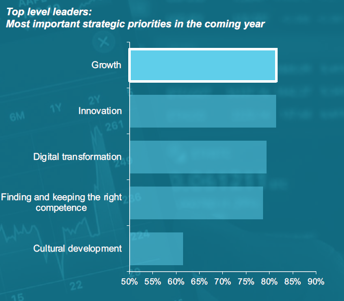 Nästan 85 procent av cheferna anser att tillväxt är deras viktigaste strategi under det kommande året. Förutom att fokusera på tillväxt genom innovation kommer det att synas att många företag investerar i ”revenue intelligence”. Detta är en fullständig genomgång av alla aspekter av verksamheten. Det är inte bara på säljavdelningen som tillväxtpotentialen finns – även i leverantörskedjorna, till exempel kommer du genom att tänka strategiskt kunna optimera dig till stora besparingar och därmed ge resurser till mer tillväxt.
