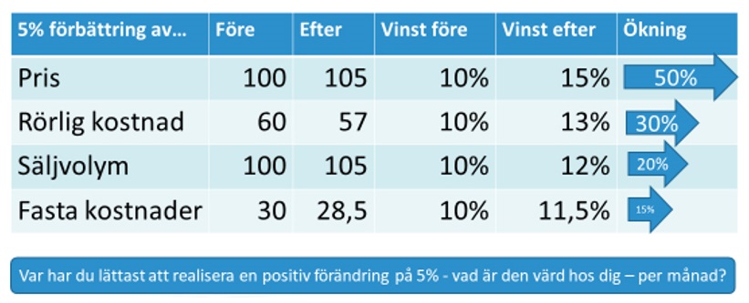 Hävstången, och påverkan på resultatet av en 1-procentig förbättring av pris är mycket större än motsvarande ökning av säljvolym, eller minskning av rörliga eller fasta kostnader. Vad är lättast att realisera hos er: öka pris 1% eller sänka rörliga kostnader med 1%? Tänk dessutom på hur roligt det (INTE!) är att ytterligare en gång skära i kostnader och hur det påverkar humöret.