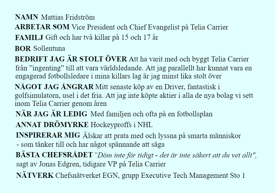 Mattias Fridström har varit med på hela Telia Carriers resa. Från att det nya, helägda dotterbolaget till Telia Company, för femton år sedan dömdes ut i svenska medier som ”ett av Sveriges största ekonomiska industrifiaskon någonsin” (DN 8 dec 2004) och visade minus 1 miljard kronor i förlust under 2002. Det var då det. I själva verket hade den avgörande vändningen redan börjat, med nya krafter från den nyrekryterade vd:n Eva Lindqvist som tillsatts till det blödande företaget.
