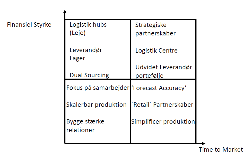 Som det fremgår på illustrationen, kan man kategorisere sit arbejde med forsyningskæder. Her er det Heidi Rosendal Larsens pointe, at man som virksomhed skal anerkende sine forudsætninger og arbejde ud fra disse. Hvis man er en mindre virksomhed uden de store finansielle muskler, kan man vinde meget på kort tid ved at opbygge stærke relationer.